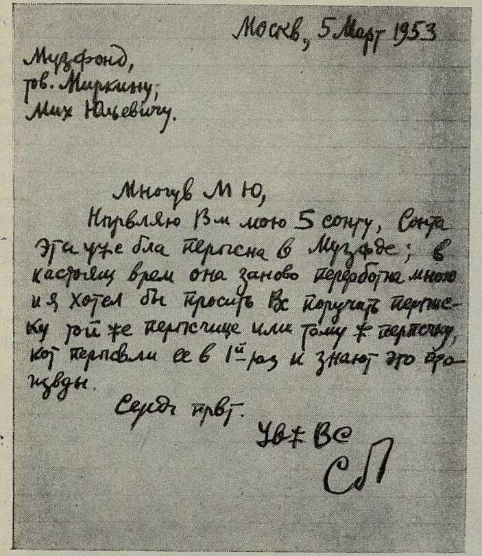 Направляю Вам мою 5 сонату. Соната эта уже была переписана в Музфонде; в настоящее время она заново переработана мною и я хотел бы просить Вас поручить переписку той же переписчице или тому же переписчику, которые переписывали ее в 1-й раз и знают это произведение.