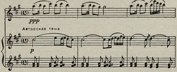 финала его Виолончельной сонаты (цифра 36 клавира). С большим изяществом полифоническое соединение двух тем применено во второй, лирической, части Флейтовой сонатины. Первая тема здесь народная песня «Хайрисак девана». Вторая возникает как естественное продолжение первой. Возможно, именно потому так прозрачно и гармонично их полифоническое соединение.