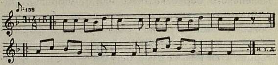 1 Пятидольные размеры проникли в креольскую музыку из Испании, где они широко представлены в баскских сортсико, а также в кастильских руэдах, «майских» песнях и некоторых романсах.