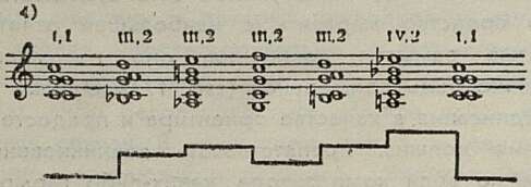 Аккорды имеют различную степень гармонической напряженности, зависящую от их интервального состава и расположения. Переход от одного аккорда к другому либо сохраняет тот же уровень напряжения, либо изменяет его в ту или другую сторону более или менее резко. Изменение гармонического напряжения при последовании аккордов образует подъемы и спады — гармонический рельеф сочинений (harmonisches Gefälle). Взглянем еще раз на таблицу аккордов. Гармоническое напряжение возрастает при переходе от трезвучий к их обращениям внутри I группы, от аккордов I группы к аккордам II группы, от II к III, от III к IV, одним словом, при всяком переходе вниз или вправо по таблице. Исключение составляют неопределенные аккорды V и VI групп: их гармоническое напряжение примерно равно напряжению аккордов II группы. Имеются здесь и более тонкие градации. Если взять два аккорда одной подгруппы, например III, 1, из которых один больше похож на трезвучие, чем другой, то при их последовании гармоническое напряжение также изменится, хотя и чуть заметно. Тональные отношения не играют здесь никакой роли: при соединении двух трезвучий квинтового соотношения гармоническое напряжение остается на одном уровне.