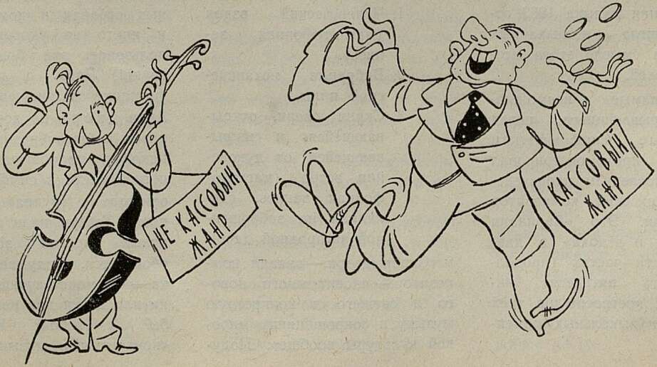 Здесь существует четкое разграничение жанров по единственному признаку — сборы. В ходу даже специальный термин: «кассовый жанр». Халтурные изделия Ю. Батицкого и иже с ним, имеющие весьма отдаленное отношение к музыке, — «кассовый жанр»; серьезная музыка не кассовый: концерты могут не окупиться. Не приходило ли, однако, в голову руководителям крупнейшей концертной организации республики, что и серьезная музыка может стать самым «кассовым жанром»? Ведь искусством нельзя торговать, его надо пропагандировать! Если бы работники Министерства культуры УССР захотели заметить ярмарочные торги в Укрконцерте, они бы вспомнили эту простую как азбука истину. И пришел бы конец подобным ярмаркам с их лежалым товаром.