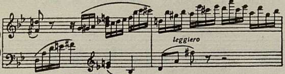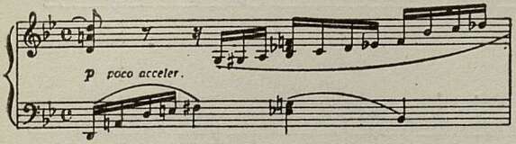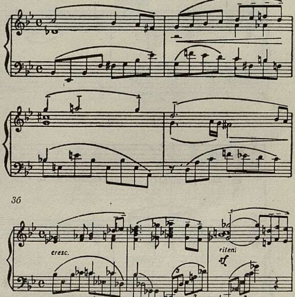 Интересно и то, что по мере развития пьесы, мелодия все более просветляется. В коде же речитативность проникает уже не только в мелодию, но и в гармоническую фигурацию сопровождения.