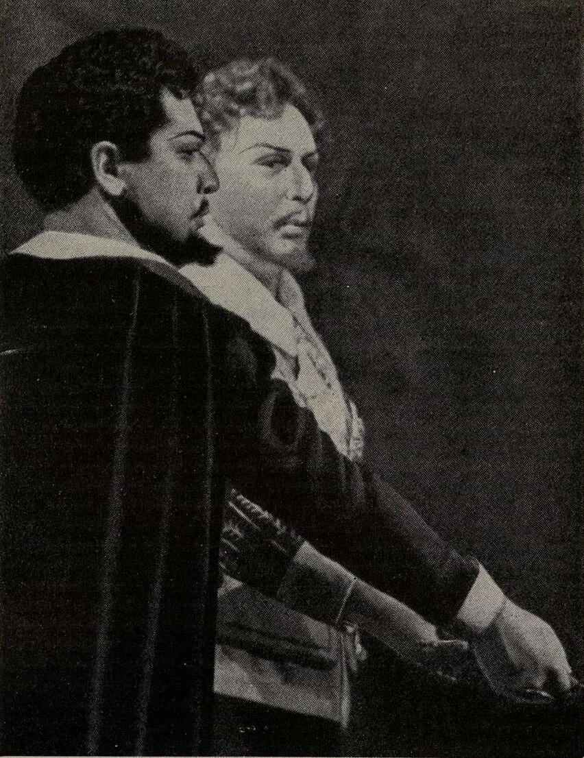 Но авторы спектакля пошли дальше всех других «версификаторов» оперы. В открывающей спектакль первой картине II акта они поделили часть партии монаха (тени Карла V) между Филиппом и Великим инквизитором. Причины этого понятны: постановщики хотели углубить образ Великого инквизитора, один из важнейших в опере, и ввести его в действие с самого, начала. Этого они достигли. Но при этом не обратили внимания на то, что интонационный строй партии монаха совсем иной, чем у Великого инквизитора. Он несравненно более патетичен. К тому же появление на сцене Великого инквизитора только в IV акте, как это обсуловлено у Верди, придает его образу несравненно большую значительность.