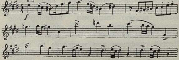 К примеру, порывистая тема из Пятнадцатой симфонии, включающая ряд элементов, типичных для ранних произведений композитора; острый ритм, сопоставляемый с