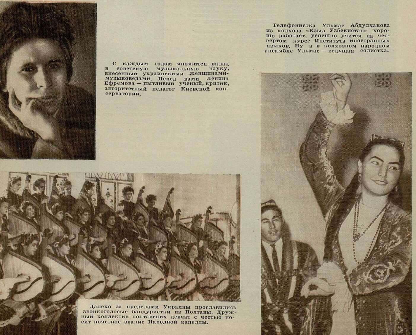 Телефонистка Ульмас Абдулхакова из колхоза «Кзыл Узбекистан» хорошо работает, успешно учится на четвертом курсе Института иностранных языков. Ну а в колхозном народном ансамбле Ульмас — ведущая солистка.