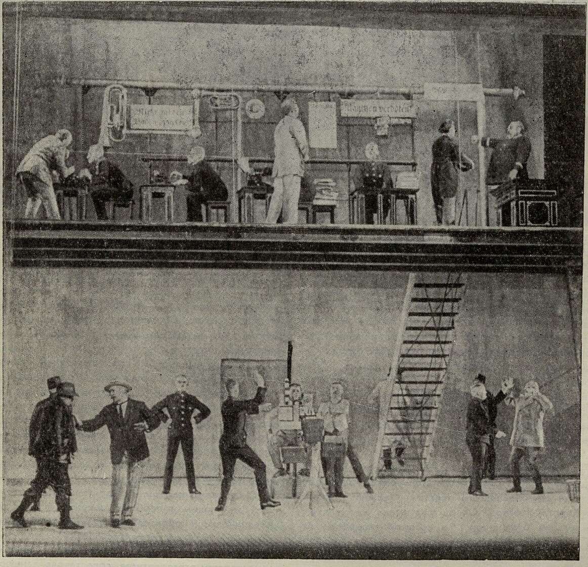 предметов быта (граммофона, телефона, фотографий и т. п.) перемежаются с остроумно использованными приемами театральной условности. Так, в неподвижном — в натуральную величину — вагоне поезда пассажиры впадают в непрерывно убыстряющуюся «виттову пляску»; и мы реально ощущаем движение быстро несущегося поезда. Это и смешно и предельно правдоподобно. В психиатрической больнице разыгрывается уморительная клоунада, в которую оказываются вовлеченными и сами врачи-психиатры.