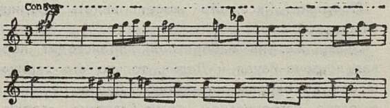 Последнее обусловлено введением в музыкальную ткань пьесы развитой системы лейтмотивов. Большая часть их «экспонируется» уже во вступлении, другие появляются позже, «своим чередом». Отмечу прежде всего начальные «фанфарные возгласы», открывающие действие. Этот яркий, легко запоминающийся лейтмотив, состоящий из трех восходящих мажорных трезвучий, — своеобразная «музыкальная эмблема» спектакля. Он сразу вводит слушателя в общую романтически приподнятую атмосферу происходящего: