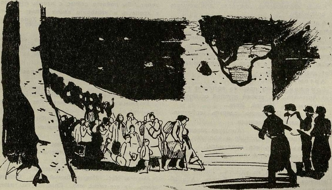 На авансцене часть крепостной стены; в пробитые снарядами отверстия видны напряженно следящие за женщинами глаза наших бойцов. Женщин встречают немецкие солдаты. Они берут их в кольцо. Кольцо замкнулось. Женщин повели... Вдруг молоденькая жена лейтенанта Синицына рванулась назад.