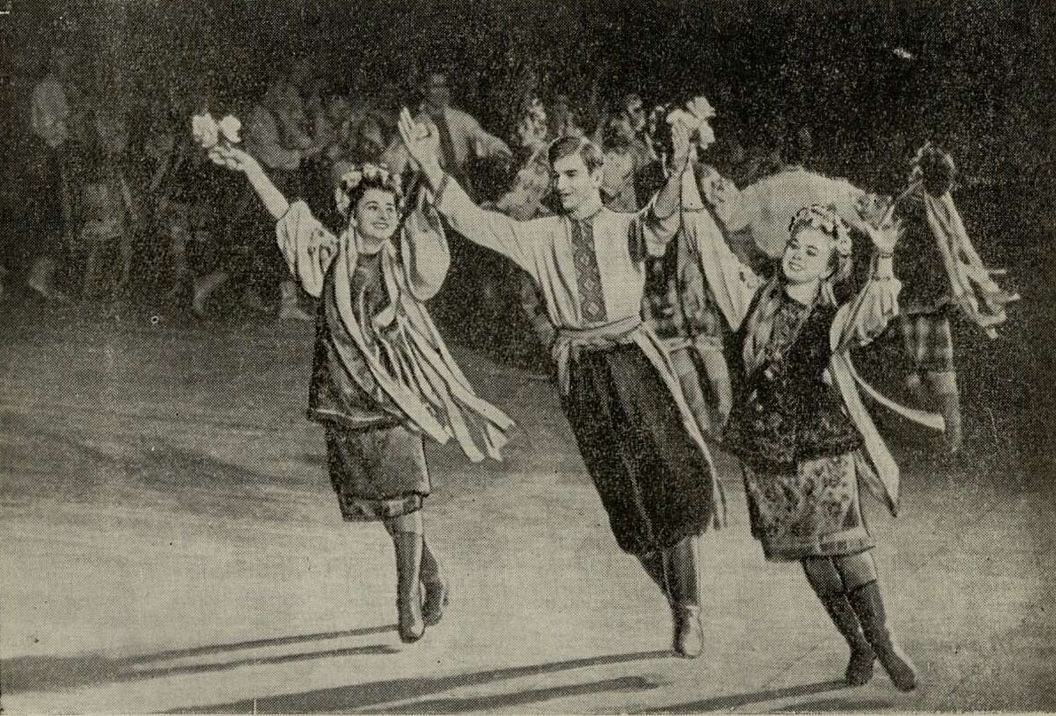 Мне «повезло» на гопаки. Что ни номер смотра, то обязательно гопак, причем не тот знаменитый, истинно украинский гопак, с характерным для него многообразием композиций и обилием местных вариантов, а убогий «штамп», рожденный некогда примитивной фантазией хореографа-ремесленника, что не помешало танцу буквально наводнить подмостки. Ведущий объявлял названия предприятий, имена и профессии исполнителей, а зрители видели одну и ту же схему: сначала медленная «веснянка», за ней быстрая часть (иногда эти части менялись местами), а на закуску пресловутые «трюки». Но бот ведущий объявил выступление ансамбля «Ятрань» Кировоградского агрегатного завода. На сцене девушки и юноши весело «жали» пшеницу для последнего снопа (есть на селе такой обычай — жать последний сноп вручную, а затем, перевязав золотые колосья красной лентой, украсить им стол на колхозном празднике). Бескрайнее колхозное поле простиралось до горизонта, где тянулась линия электропередач. Живой современностью, поэзией вдохновенного труда повеяло на зрителей. Словно море пшеницы колыхалось на ветру — двигались в затейливых построениях ряды танцующих. И вдруг рассыпались на небольшие группы, это ожили и закружились пшеничные снопы.