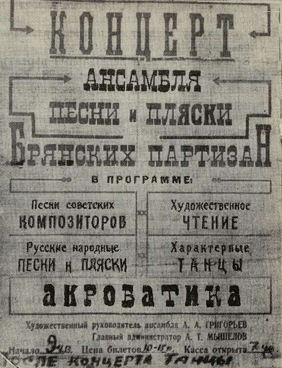 Партийные и комсомольские организации партизанских отрядов придавали большое значение развитию художественной самодеятельности. Имеются сведения, что в апреле 1942 года Навлинский подпольный райком партии принял специальное решение об организации агиткультбригады в отряде «Смерть немецким оккупантам», которая обслуживала партизан и население Брянщины1. В июле 1942 года на заседании Суземского подпольного райкома ВЛКСМ стоял специальный доклад секретарей комсомольских организаций отрядов им. Буденного, «Большевик» и др. о состоянии художественной самодеятельности в этих отрядах2. Коллективы организовывались и в других брянских отрядах, на основе которых после объединения их в бригаду под командованием Героя Советского Союза Д. Емлютина был организован ансамбль песни и пляски, просуществовавший до 1947 года.