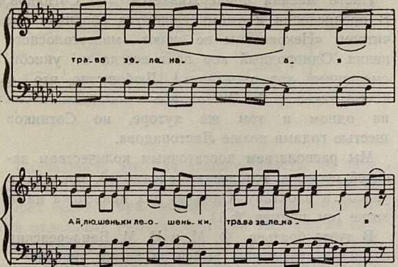 Иного мнения придерживается Т. Сотников. В предисловии к упоминавшемуся сборнику мы читаем: «Некрасовцы не знают многоголосного пения. Однородный хор поет всегда в унисон, смешанный хор в октаву»1. Любопытно, что и Т. Сотников и А. Листопадов записывали песни на одном и том же хуторе, но Сотников шестью годами позже Листопадова.