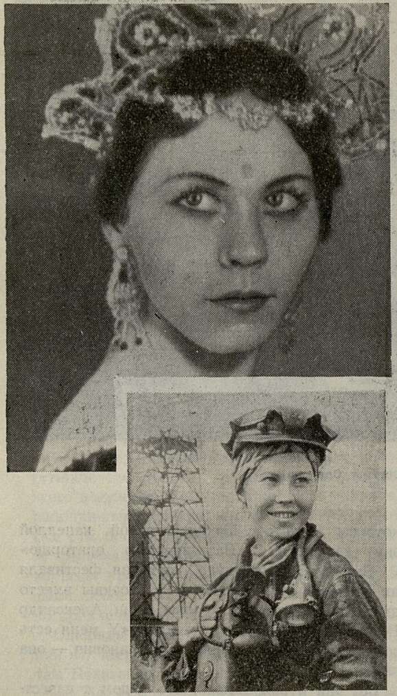 Это Валентина Яблокова — солистка народного театра балета в Новокузнецке (руководитель — Л. Крылов). Днем она работает в шахте, а вечерами овладевает искусством танца. На верхнем снимке: В. Яблокова в роли Никии из балета «Баядерка».