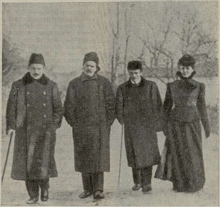 Фотограф запечатлел на прогулке (слева — направо) А. Толстого, М. Горького, А. Гольденвейзера и Е. Пешкову.