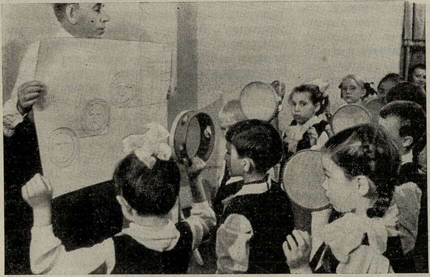 На плакатах изображены крупные цветные ноты. В руках у детей бубны. Они под музыку «ходят по нотам» на четыре, на две и на три четверти, выполняя нарисованные на плакатах простейшие ритмические задачи. Это уже начало чтения с листа нот, пока еще изображающих только ритм.