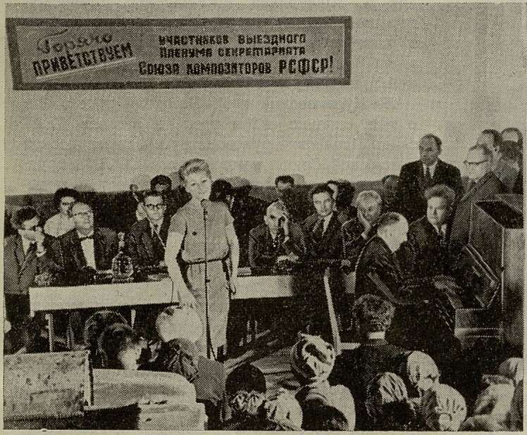 В Ростове состоялся выездной секретариат Союза композиторов РСФСР. В его работе принимали участие многие выдающиеся мастера советского музыкального искусства во главе с первым секретарем республиканской композиторской организации Д. Шостаковичем. Интересно прошли встречи композиторов с трудящимися промышленных предприятий города и области. На снимке: в гостях у рабочих химического завода им. Октябрьской революции. Арии из оперетт Ю. Милютина исполняет артистка Ростовского театра музыкальной комедии Р. Виличко. У рояля — композитор Ю. Милютин.