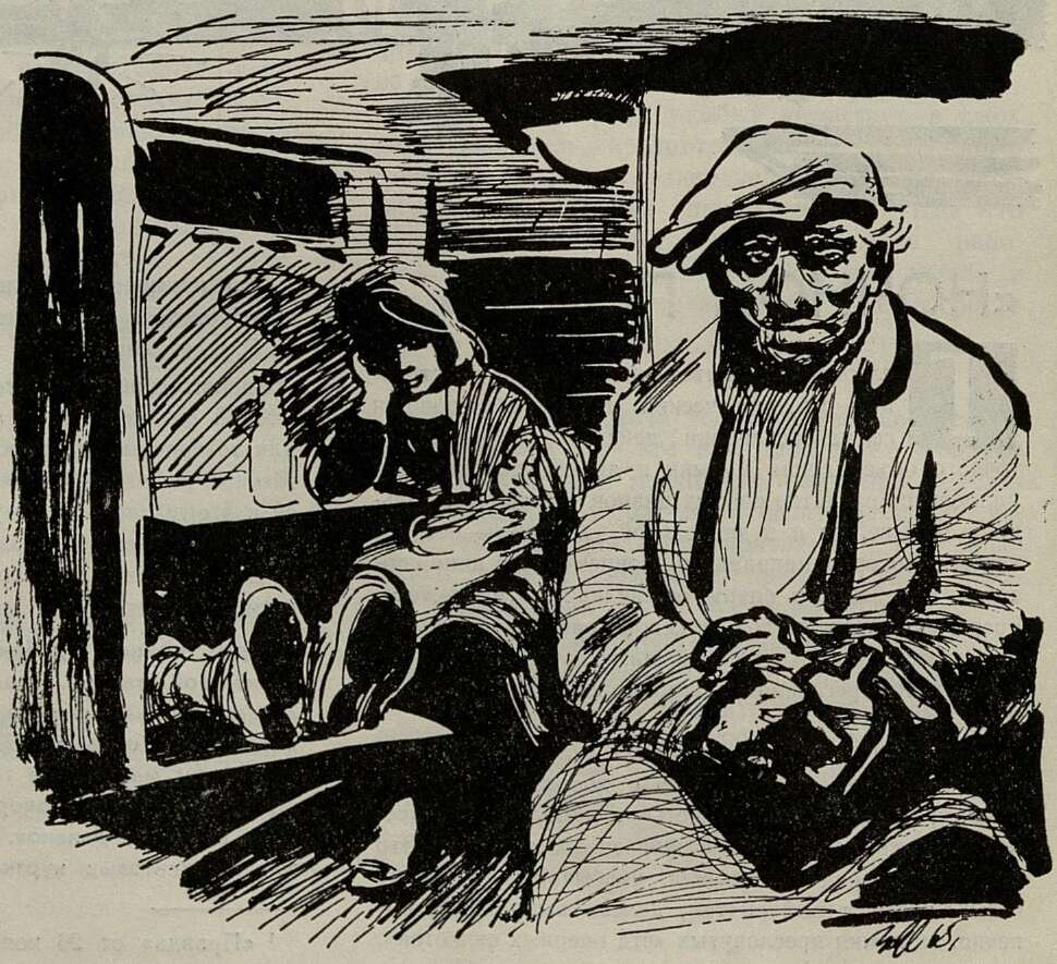 «Этот ночной «рабочий» поезд останавливается на каждой станции. Проводник негр с грохотом отодвигал дверь и выкрикивал очередную остановку. Вздрагивая, открывала глаза девочка, спавшая на коленях у матери. Из тамбура несло ночной сыростью. «Спи, спи, — говорила мать, молодая женщина, — нам еще далеко». Четверо парней в одинаковых брезентовых куртках и в резиновых сапогах