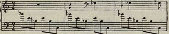 Постепенно кварто-квинтовая координация начинает уступать место тритоновой, с которой связана вся система устойчивых координат в позднем творчестве Скрябина. Альтерация квинты в доминантовых комплексах становится настолько постоянным явлением, что ее диатонический вариант исчезает совершенно. Длительное балансирование на уменьшенной квинте в басу подготавливает эту основную новую устойчивую координацию в позднем стиле. Внутри тонической функции это координация между I — IV#, внутри субдоминантовой — между IV–VII, внутри доминантовой — между V–II♭, как в следующем примере: