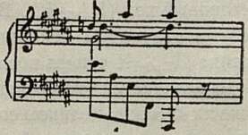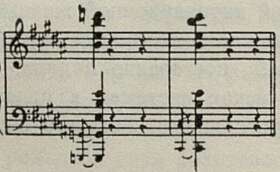 Все эти пути ведут в конечном итоге к образованию основного скрябиновского созвучия («прометеевского аккорда»), утвердившегося в позднем периоде как своеобразный заменитель тоники. В целом виде он появляется и раньше, но еще в рамках традиционных ладовых форм и потому на правах диссонанса и неустоя с обязательным разрешением (как Д в Т или ДД в Д). Чаще всего он встречается в виде разложенной гармонической фигурации: