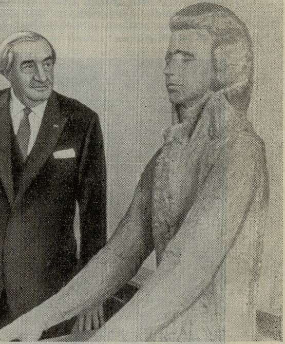 Во время приема артистов «Моцартеума» скульптор В. Туманян поднес гостям в дар вылепленный им бюст Моцарта. На снимке: Б. Паумгартнер у скульптуры.
