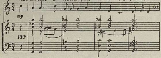 В связующей партии зарождается полная успокоенности и благородства тема хорального склада, но образ этот с самого начала двойствен, внутренне противоречив: на фоне хорала время от времени появляется настораживающий, «предупреждающий» квартовый мотив.