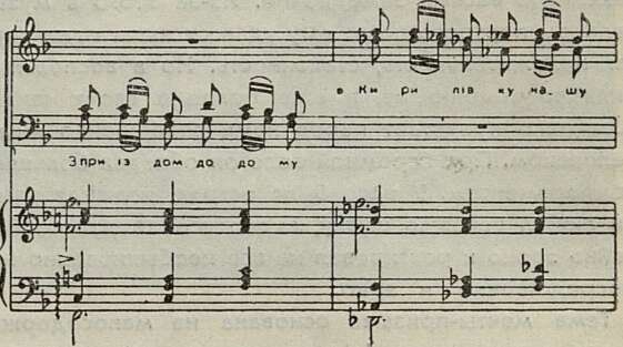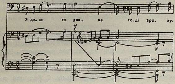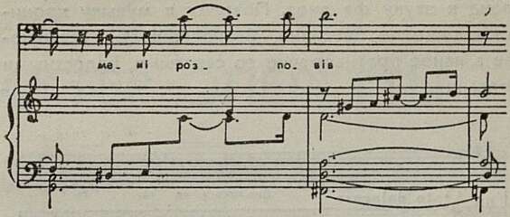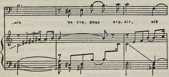 Лирическими настроениями окрашена партия Шевченко даже в таком драматическом эпизоде, как сцена с Оксаной. Видя сошедшую с ума девушку, поэт произносит полные гнева слова: «Кари, кари за муки невинних!» Тут бы нарушить плавность музыки, сделать мелодию более взволнованной, «порвать» фразу. Нет, композитор, по-прежнему верный своей манере высказывания, делает и эту речитативную фразу распевной, и вместо гнева в ней начинает звучать мука. Характерно, что точно так же композитор интонирует несколькими тактами ранее совсем другие по смыслу слова: «О нещасна голубка моя!» Подобное равнодушие автора к эмоциональному состоянию героев наносит большой вред его музыке.