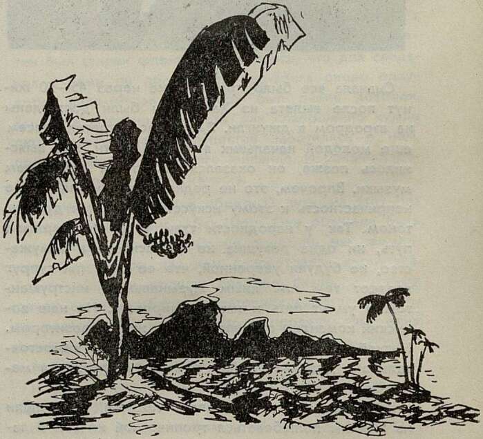 На следующий день мы совершили чудесное путешествие за семь километров в глубь гор. Путь лежал мимо двух поселков, среди диких бананов, пальм и громадных жилистых деревьев типа смоковниц или гигантских фикусов. Через час начался крутой подъем к перевалу. Идя размеренным шагом, я с упоением вглядывался в окружающую нас роскошь тропической растительности. Внизу, скрытая от нашего взора, шумела река, а мы, как по карнизу, поднимались по горной тропке, среди великолепной до опьянения ароматной заросли.