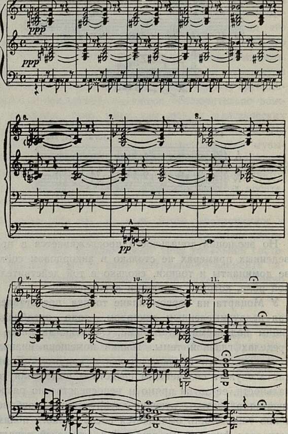 Ля минор здесь — уже мнимая тональность. Приведенный пример действительно может считаться атональным, но не потому, что в нем нет тональности — тональность (или тональная система) всегда есть в музыке3, — а потому что определение тональности как ля минора почти ничего не объясняет в гармонии. Не тональность изжила себя, а изжил себя (в данном случае) термин «ля минор», уже слишком приблизительно, слишком неточно характеризующий новое содержание тональности. Все промежуточные аккорды никак не определимы с точки зрения «трех стержней»: это не тоника, не доминанта и не субдоминанта. Последний аккорд сходен с доминантой лишь по отношению к тонике только