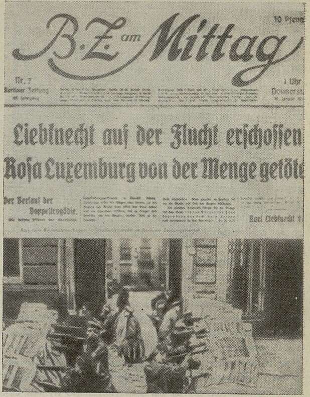 ...29 декабря 1918 года. Всегерманская конференция «Союза Спартака» (так стала именовать себя группа левых германского «Интернационала») принимает решение о создании коммунистической партии. Через неделю, 5 января 1919 года, социал-демократическое правительство провоцирует берлинских рабочих на преждевременное и заранее обреченное на поражение выступление. 150 тысяч рабочих столицы выходят на улицы. Военный министр Носке, прозванный «кровавой собакой», бросает против них все силы контрреволюции. Кровь рабочих заливает берега Шпрее. 15 января агенты реакции зверски убивают вождей берлинского пролетариата Карла Либкнехта и Розу Люксембург. Революция обезглавлена.