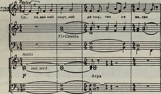 Наибольшим изменениям подверг автор напев песни «Соловей мой смутный» (шестая часть кантаты, № 31 сборника). Сгущение ладового колорита достигается как путем мелодической переменности (обороты параллельного минора), так и гармоническими средствами: на трезвучие си бемоль мажора наслоена соль-минорная тоника, что лишь по схеме аналогично тонике с секстой, а по сути «биладово».