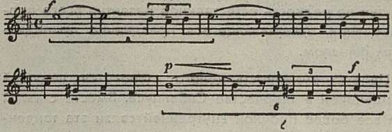 Лаконичные мотивы становятся исходными точками и при развертывании больших симфонических полотен у Сибелиуса. Постоянная тяга композитора к экономии и концентрации средств выражения из года в год все увеличивается. Идеальное «музыкальное произношение» представлялось ему в органической мотивной связи всего тематизма. Таким образом, любой мотив, появляясь постоянно в новых тематических образованиях, каждый раз приобретает новое качество и новый характер. Впервые такая техника последовательно применена Сибелиусом во Второй симфонии. Здесь вся ведущая тематика сводится в конечном итоге к двум мотивам-ячейкам (см. пример № 2): к восходящему или нисходящему поступенному ходу в пределах терции («а») или к выдержанному (или повторяемому, или обыгрываемому соседними ступенями) звуку, завершающемуся скачком вниз на квинту («б»). В первой части симфонии на мотиве «а» построены вступительные такты и главная тема, побочная же строится на более активном мотиве «6». Между главной и побочной темами, там, где в традиционной сонатной форме обычно отводится место для связующего материала, у Сибелиуса появляется еще одна тема у солирующих скрипок. Она особенно значительна, так как именно из нее в конце разработки вырастает кульминация. Она соединяет в себе оба мотива — «а» и «б»: