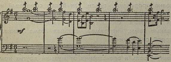 В партитурах Сибелиуса встречаются самые различные имитационные приемы и даже небольшие фугато. В начальных же разделах Шестой и Седьмой симфоний появляются свободные противопоставления мерно льющихся линий струнных. Такой тип полифонии был свойствен уже только позднему Сибелиусу. Вот в качестве иллюстрации несколько тактов из его Седьмой симфонии:
