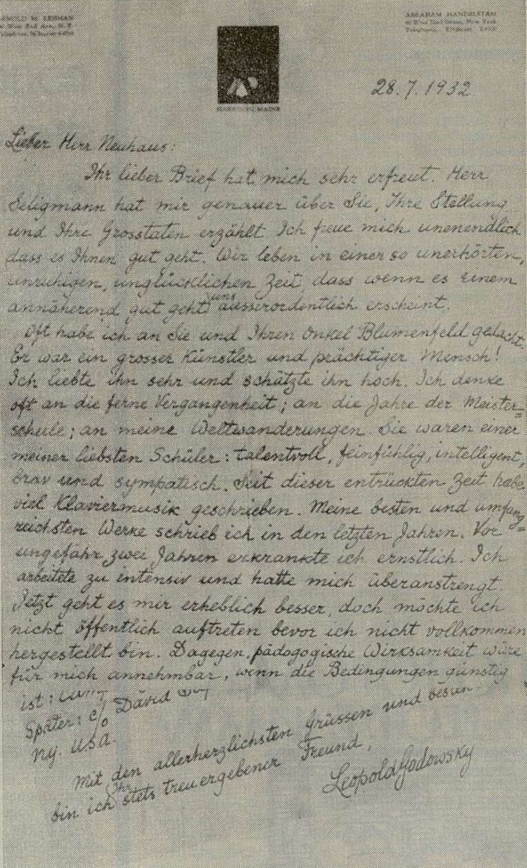 Я часто думал о Вас и Вашем дяде Блуменфельде. Это был большой художник и прекрасный человек! Я высоко ценил и очень любил его. Часто думаю о далеком прошлом, о годах Meisterschule, о поездках по свету. Вы были одним из любимейших моих учеников, талантливым, тонко чувствующим, умным, смелым, обаятельным. С тех давних пор я написал много фортепианной музыки. Наилучшие и самые разнообразные сочинения я написал в последние годы. Приблизительно два года тому назад я серьезно заболел. Слишком интенсивно работал и переутомился. Сейчас чувствую себя значительно лучше, но все же не хотел бы выступать публично, пока совсем не поправлюсь. Напротив, педагогическая деятельность была бы для меня при благоприятных обстоятельствах более приемлемой. Мне представляется интересной возможность проводить в России ежегодно по три месяца. Пожалуйста, напишите об этом подробнее <...>