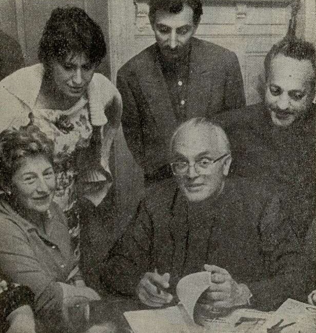 Вместе с группой советских журналистов, гостивших в Дании, она присутствовала на пресс-конференции в редакции коммунистической газеты. «Land og Folk». Там был и Бидструп. Пока он давал автографы участникам конференции (этот момент запечатлен на фото), Э. Гинзбург удалось зарисовать его и получить от художника подпись на рисунке.