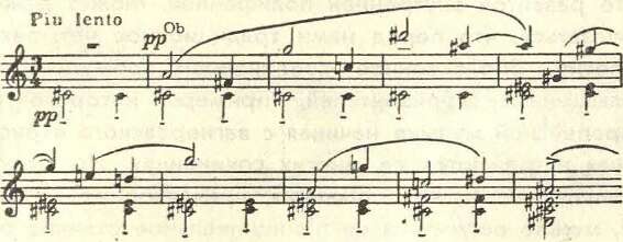 Вряд ли можно отрицать своеобразную выразительность напевной мелодии гобоя, плавно развертывающейся, несмотря на обилие широких скачков. В ней также применен принцип постепенного завоевания хроматического звукоряда с характерной неповторяемостью звуков. Основной тон остинатной гармонии — до диез. Интересно, что звуки гармонического сопровождения настойчиво избегаются в мелодии (в первом примере этого не было). Плавная линия как будто прорезывает гармоническую вертикаль, и ее звуки переходят друг в друга, явно не разрешаясь, не сливаясь с опорными тонами2. Тем не менее соотнесенность с главным тональным центром (до диез — ми диез) ясно ощущается на слух. Что же это — своеобразная «тональная додекафония»? Точнее, тональная двенадцатиступенная хроматическая система3.