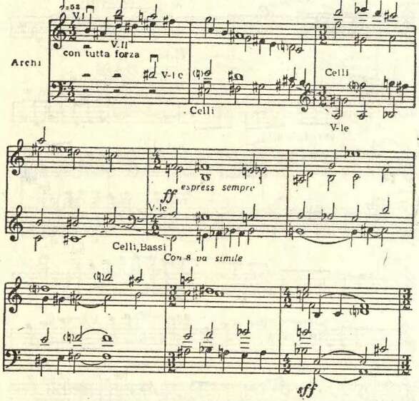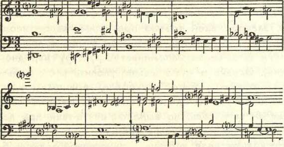 Но из этого не следует, что приведенный отрывок представляет собой лишь случайные, произвольные сочетания, никак не скоординированные в высшем синтезе. Такое мнение означало бы поверхностное восприятие музыки и нежелание по-настоящему услышать ее. Здесь на первый план выступают те средства, которые в классической «альтерационной» хроматической гармонии не были в достаточной мере использованы. В частности, огромную, если не решающую, роль приобретает взаимная градация диссонантной (фонической) напряженности созвучий: сгущения и разрежения сочетаний звуков, тонкое распределение интервалов, логика их последовательного движения, подчас капризные и прихотливые смены регистров отдельных голосов. Все это приводит в итоге к периодическим расширениям или сужениям «звукового пространства», контрастам острого (или, напротив, смягченного и просветленного) высокого регистра и неожиданно «включенных» глубоких басов...