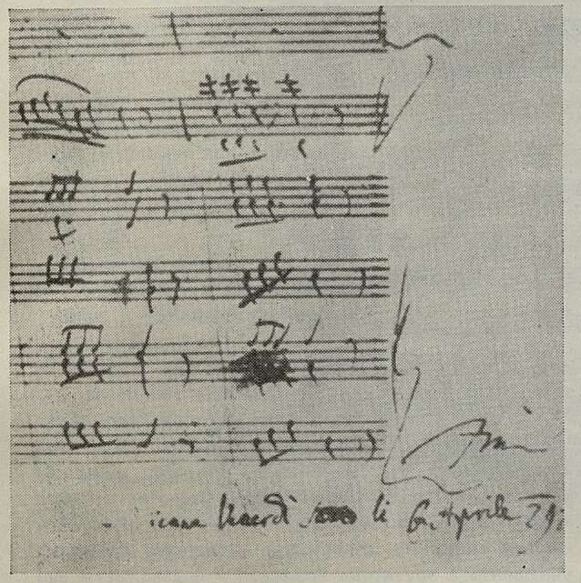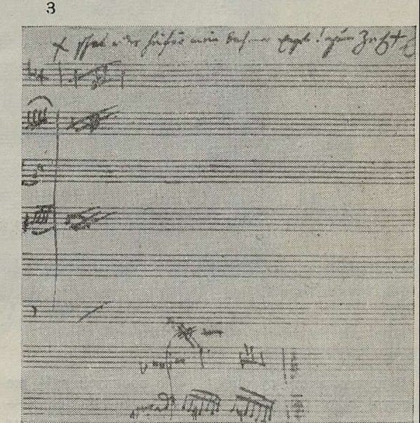 Затем после долгих пауз у солиста, среди густо зачеркнутых нотных строк и под ними ремарка: «Leitgeb bit[t]et um Hilf» 1.