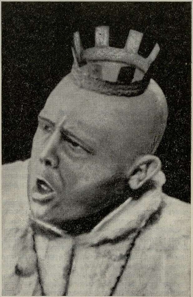 Великолепная мизансцена: Бобеш и земной шар. Маленький уродец, на совершенно лысой голове которого «приклеена» золотая корона, размерами не превосходящая на карте герцогство Монако, жадными пальцами тянется к глобусу, словно собирается проглотить его. Режиссер и исполнитель метко, хлестко соединили в Бобеше, в манере его поведения, в историческом «захлебе» его речей нравы правителей третьего рейха. И это настолько очевидно, что даже не нуждается в комментариях.