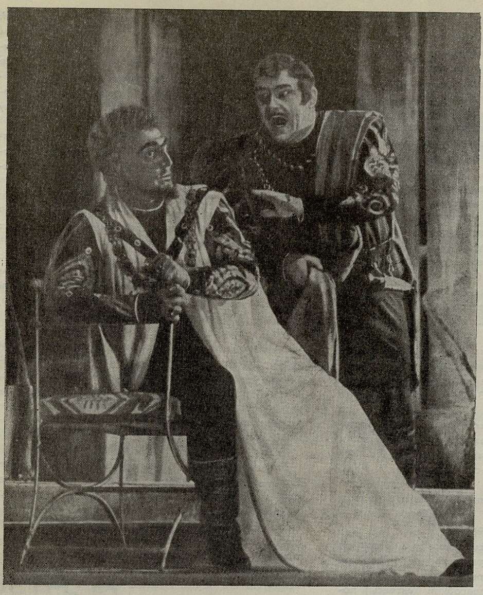 Значительно хуже обстоит дело в «Бал-маскараде»: сценическое поведение Хендрика Крумма здесь слишком наивно для драматической фигуры короля Густава; в манере Веры Нелус — пажа явно ощутимо амплуа травести с его установкой на инфантильность, а в облике офицеров-заговорщиков уж слишком явны черты давно ушедших в прошлое трафаретных романтических злодеев. Это значительно снижает ценность постановки. А жаль, потому что по вокальной культуре «Бал-маскарад» — один из лучших спектаклей, да и актерские его удачи (Кюльванд, Отс и, прибавим, Таутс — Гадалка) в ряде сцен бесспорны.