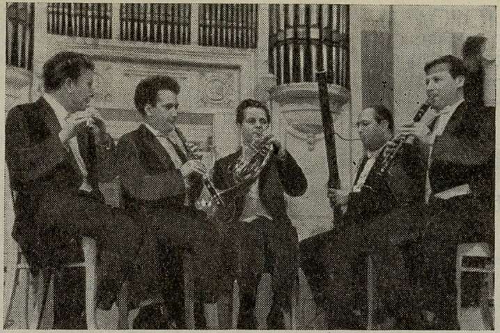 Более подробно расскажем еще об артистах духового квинтета: Л. Перепелкине (флейта), В. Курлине (гобой), М. Измайлове (кларнет), В. Буяновском (валторна), Л. Печерском (фагот).