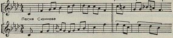 Такое строение напева — замкнутая волна в диапазоне ноны с затактовым квартовым шагом на тонику вначале — типичнейшее для норвежской народной музыки, откуда оно и перешло в профессиональную. Стоит сравнить эту мелодию с «Песней Сольвейг» Грига или с многими другими родственными ей григовскими напевами (например, из цикла «Девушка с гор»), как обнаруживается единство их источника. А вот пример подобной мелодии в норвежском фольклоре:
