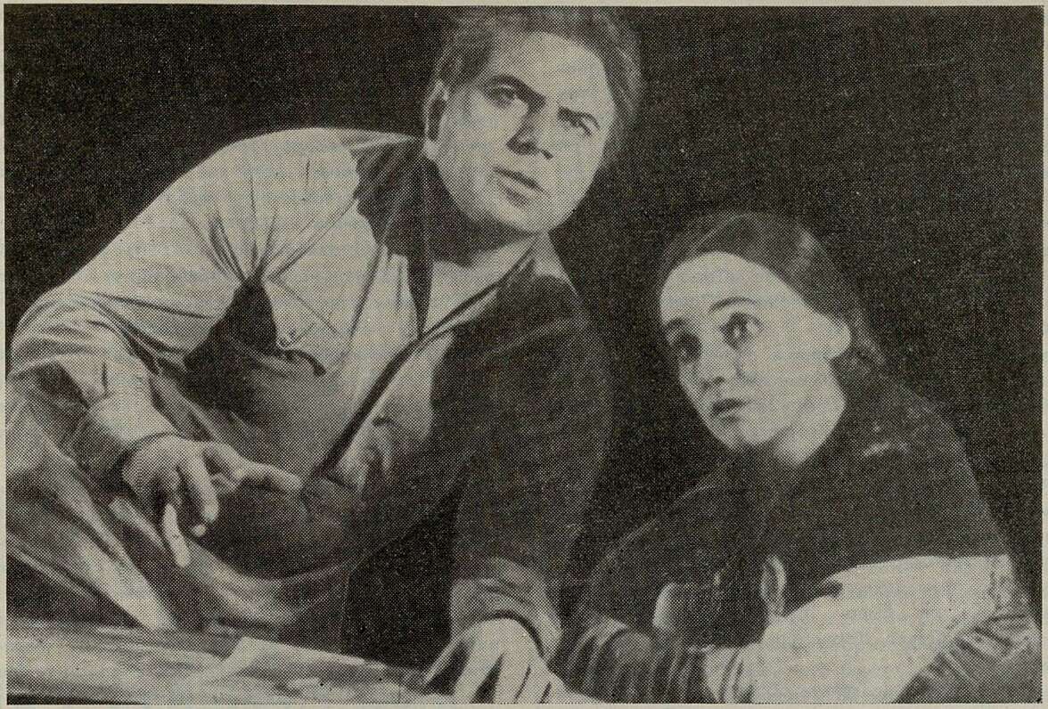 Пусть не думают, что забыла я об удачных кинопроекциях (березы в дуэте Василия и Анюты; убегающие вдаль кусты и деревья в картине движущегося поезда) или сценку, где строители смотрят кино и косые белесоватые лучи из правой кулисы выхватывают из тьмы их головы. Помню. Это хорошие эпизоды. Но что они могут изменить в общей концепции спектакля? И чем могут помочь ей актеры? Отдадим им должное. Попова (Анюта), как обычно, поет сильно и выразительно. Колоритны О. Русанов (Федор), Е. Жариков (Степан) и А. Ковтун (Расстрига), особенно Жариков, со своей провинциальной претензией на шик в напомаженных волосах, шелковых штанах и небрежной манерой кидать слова. К сожалению, Я. Иванову (Губанов) кажется почему-то, что быть мужественным коммунистом — значит глядеть на всех, даже на парторга мрачно-насупленно. Хоть бы одна улыбка! Поет он старательно, но оживить музыку ему не дано. Тут даже Червонюк (Хромченко) оказывается почти бессильным. Крайне раскаченные голоса И. Бронниковой (Катя) и Б. Малкова (машинист) дополняют во многом неблагоприятное впечатление и от вокальной стороны спектакля...1