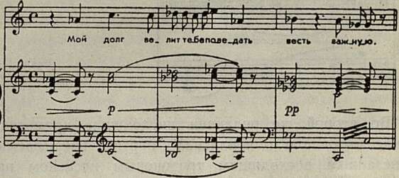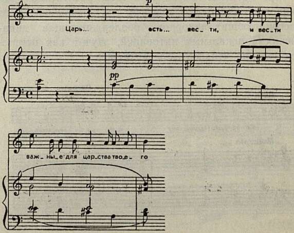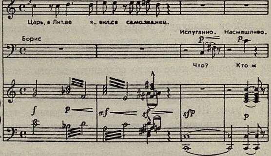 И в первой, и во второй редакции с самого начала диалога внимание сосредоточивается на вести о появлении Самозванца. Но в основном варианте сообщение Шуйского получает более рельефную форму выражения: здесь повторено дважды слово «вести» и добавлены слова «для царства твоего», подчеркивающие важность принесенных вестей для судьбы Бориса. Кроме того, не ограничиваясь изменениями, внесенными в либретто, Мусоргский более выразительно использует возможности музыкальной интонации. В то время как в первой редакции акцентировка смыслового значения фразы достигалась преимущественно с помощью аккордовой краски (прозрачное звучание трезвучий нарушалось появлением малого вводного септаккорда при слове «важную»), во второй редакции акцентирующую функцию исполняет весь интонационный комплекс — слово «важные» здесь подчеркивается интонационно, метрически и тесситурно при помощи восходящего квартового хода на сильной доле такта: