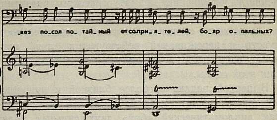 Во второй же редакции нисходящие хроматические интонации в вокальной партии, прерываемые внезапным восходящим тритоновым наскоком при словах «бояр крамольных» звучат с небрежной самоуверенностью, переходящей в открытую издевку.