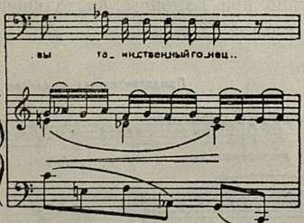 В крупном плане дано здесь и музыкальное развитие: центр тяжести переносится с передачи смысловых оттенков слов на музыкально-обобщенное выражение основной мысли и эмоционального подтекста фразы. Объединяя музыкальный материал реплик Шуйского, Мусоргский превращает отдельные восходящие интонации в единую восходящую мелодическую линию, усиливая тем самым ее наступательную активность: