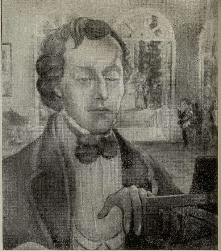 На мольберте стоит еще не законченный портрет Шопена, рядом магнитофон с записями пьес великого композитора. На пюпитре— ноты. Художник много лет играет на скрипке. Музыка — его второе призвание.