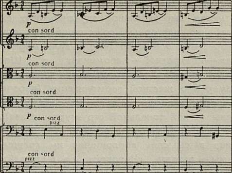 В оркестровке, очень насыщенной, несмотря на обилие соло или инструментальных дуэтов, преобладают низкие тембры, медь, фортепиано, ударные. Отметим выразительное звучание двух фаготов и особенно валторны со струнными, ведущими в разработке основную тему в виде марша, что еще раз — конкретно! — напоминает о Шостаковиче. Здесь, а затем у фортепиано и литавр она дана в намеренно жесткой гармонизации (впрочем, альтерации и аккорды отдаленных тональностей подчинены четкой тональной структуре мотива)...