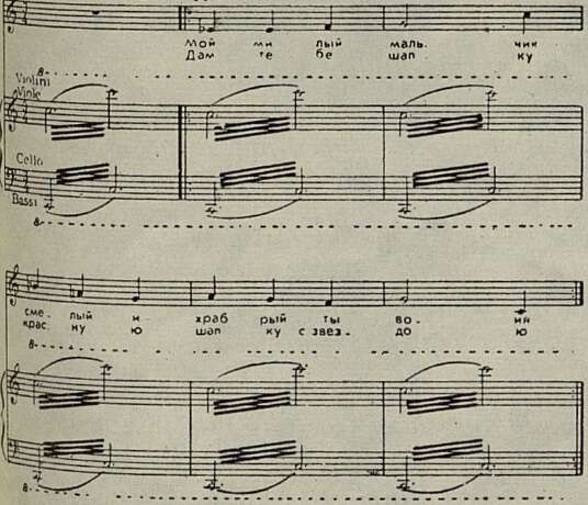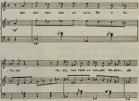 Молодому Болярову свойственна более мелодичная, более выразительная речь, в нем еще сохранились человеческие чувства, он искренне увлечен Еленой. Это почти что традиционный лирический герой. Его ариозо («Придет приказ из штаба»), которым заканчивается сцена с Еленой, напевно, темпераментно и порывисто, со свежо звучащими тональными сопоставлениями (Des-F-H-Es-c-A-g-fis). Причем именно тональная красочность создает ощущение игривости, скерцозности. Это юношеские мечты поручика о счастье с любимой: