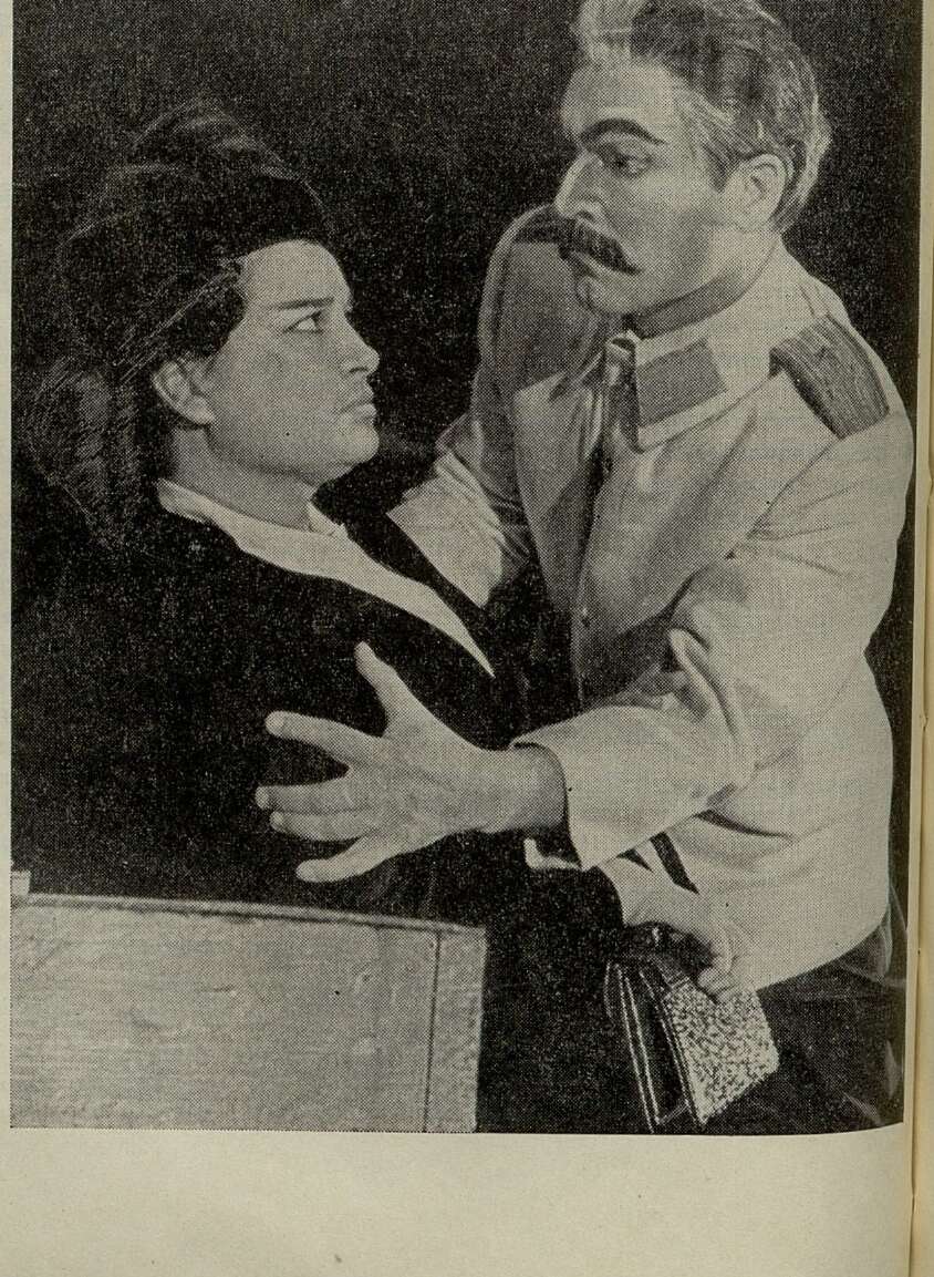 Василь Попов строит весь спектакль на резких противопоставлениях, контрасте двух эпох, в которых живут и действуют герои, подчас даже нарочито подчеркивая остроту драматических коллизий, психологическую значимость каждой интонации. Ничего лишнего, внешне показного, все скупо, предельно лаконично и динамично: мгновенно сменяются декорации, тонко обыгрываются отдельные детали оформления; например, огромное, треугольной формы полотно, то превращающееся в потолок тюремной камеры, то становящееся силуэтом карты Болгарии, то вырастающее стеной, будто разделяющей две эпохи. Использование кинопроекций, точное подчинение всех сценических компонентов (вплоть до освещения) раскрытию единой психологической линии — все это позволяет говорить о Попове как о смелом, ищущем режиссере, хорошо знающем и чувствующем современный театр, мастере интересной сценической композиции.