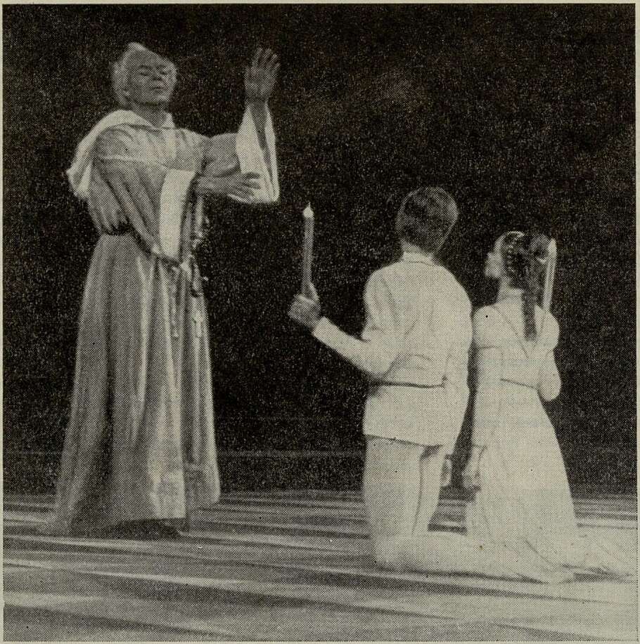 ...Тяжелым и мрачным танцем рыцарей открывается бал в доме Капулетти. Будто в заклятии подняв левую руку, широко и властно шагая, тяжело движутся рыцари и их дамы. Массивными, глухими ударами накладываются их шаги на музыку. Но вот наперерез замкнутому круговому движению легким шагом словно не бежит, а летит Джульетта. Летит в противоположном направлении, будто противопоставляя свой стремительный бег мрачной поступи рыцарей и дам.