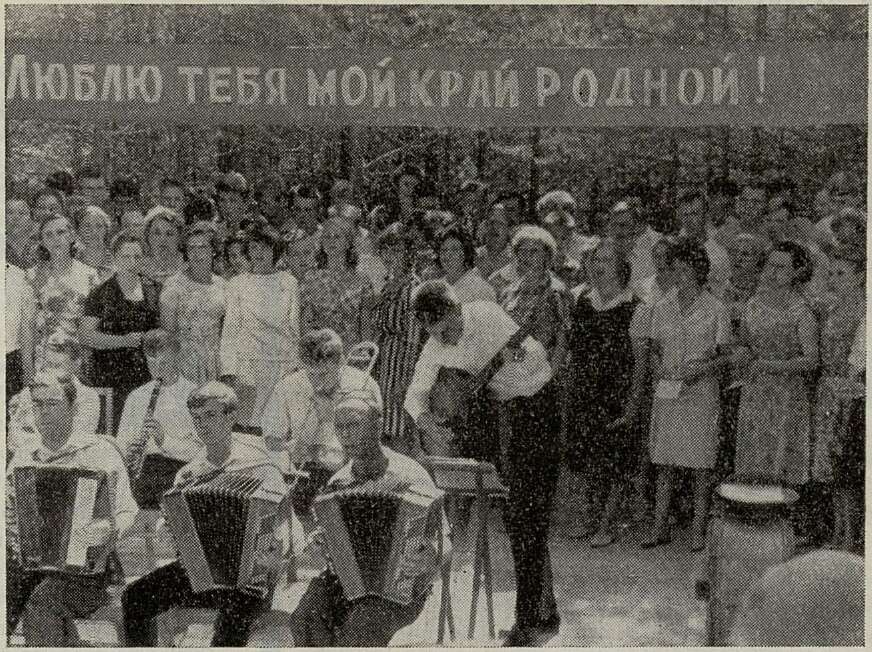 и другим приметам. Десять лет, как сложилась в районе традиция устраивать массовые праздники песни. Проводятся они ежегодно, в День советской молодежи, на стадионе или в красивом естественном парке «Борок». Готовятся широко: радио и газета, руководители коллективов заранее извещают все население. Номера разучиваются отдельными хоровыми группами (здесь всегда много работы для баянистов из музыкальной школы), причем репетиции «корректируются» по радио. Потом репетирует сводный хор.